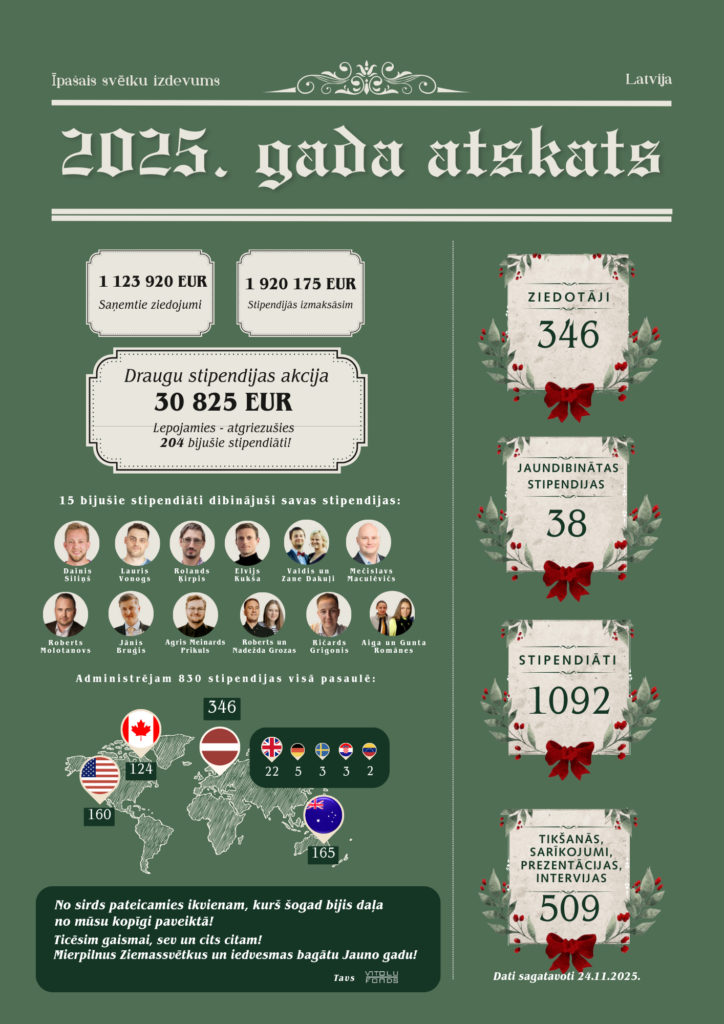 2025./2026. studiju gadā Vītolu fondam uzticēts administrēt 830 stipendijas, kopā izmaksājot 1 920 175 EUR. Šie skaitļi vislabāk apliecina, ka pateicoties ziedotāju uzticībai, mūsu atbalsts ik gadu sniedzas tālāk par vienu jaunieti – tas stiprina ģimeni un līdzcilvēkus, ko nav iespējams izmērīt vien skaitļos.